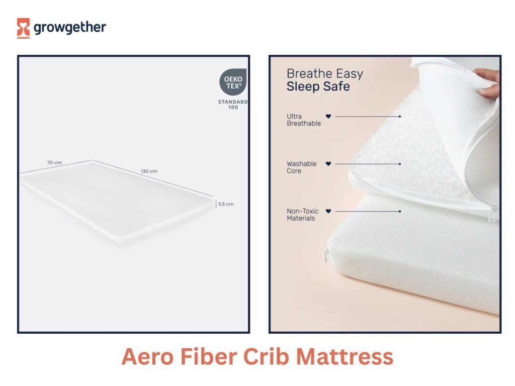 A breathable, fully washable crib mattress designed for babies from newborn up to about 4 years. With advanced Growgether’s comfortable aero fiber technology, it promotes airflow to keep your baby cool, comfortable and safe while sleeping. The firm yet supportive surface is hypoallergenic and free from harmful chemicals.