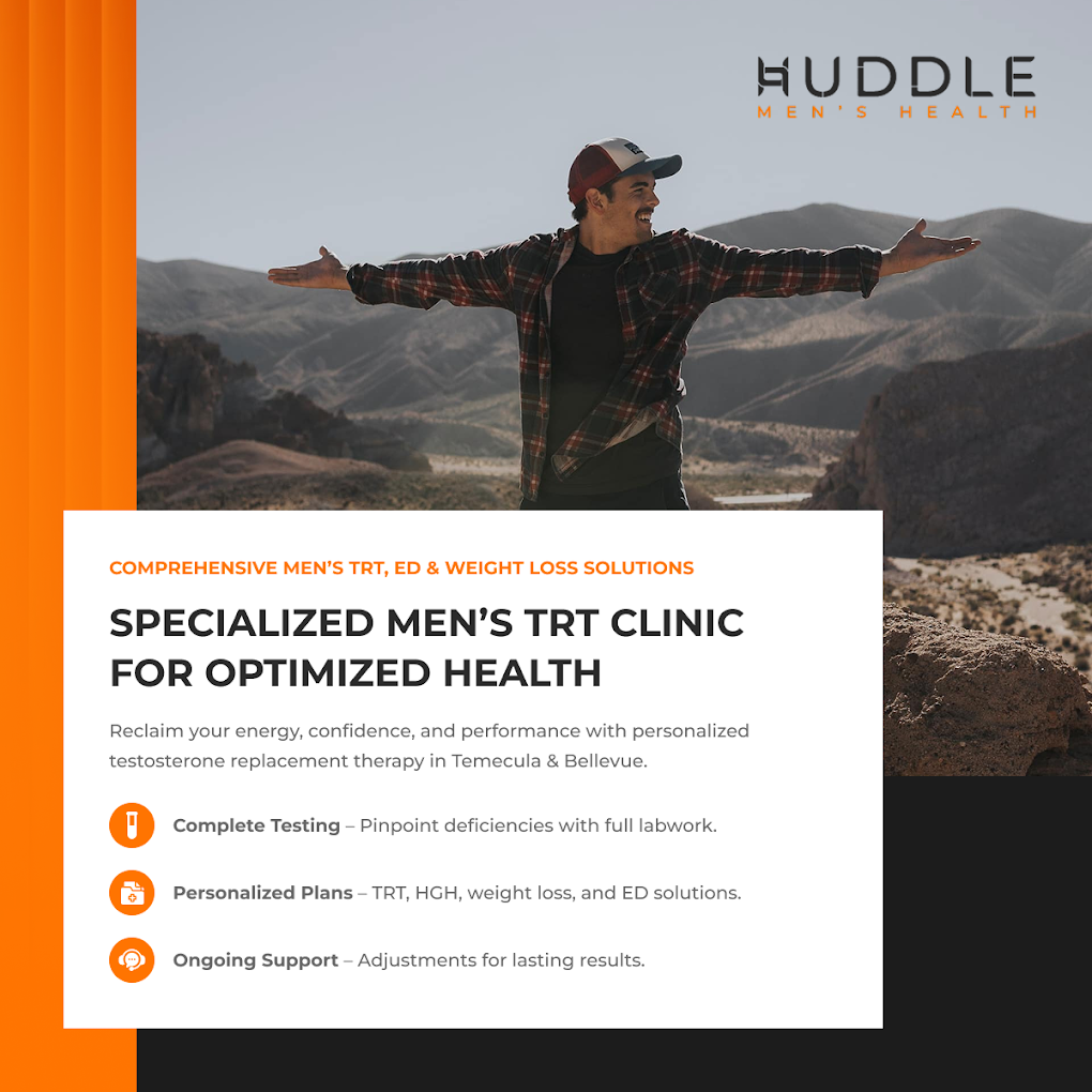 Huddle Men’s Health in Temecula provides testosterone replacement therapy (TRT), HGH therapy, weight loss programs, and ED treatment. Serving local men for over 2 years, the clinic offers free testosterone evaluations, flexible plans, and both in-clinic and telehealth consultations.